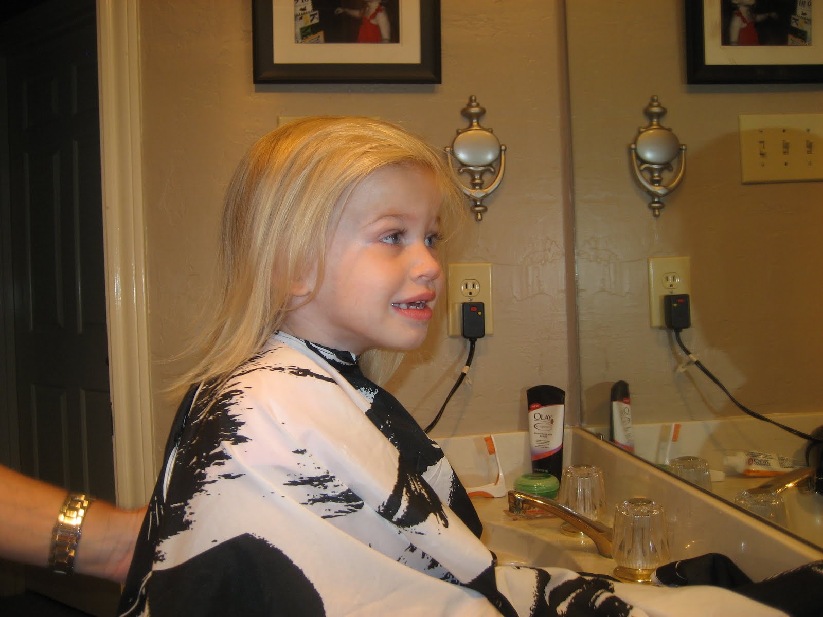 Lucky enough for us we have a fantastic hair stylist right in the family! Donna (DeeDee) came for a visit and had her cape (cake) and scissors in tow. Gates was pretty sure she wanted a cut, and when she heard she got to wear a cape (cake) she was even more excited. She did very well and sat there like a big girl!